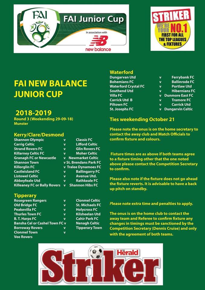 We have been drawn at home to Dunmore East FC in the 3rd round of the FAI Junior Cup.
