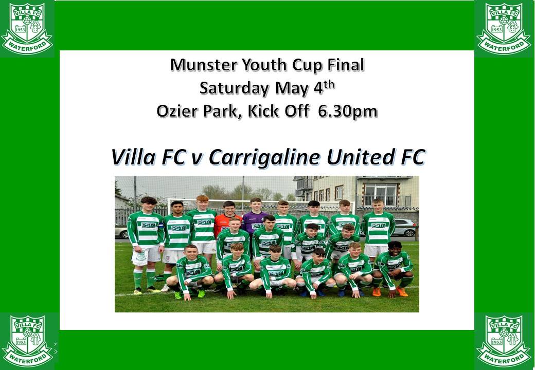 Huge game for the club on Saturday @ 6.30pm in Ozier Park as we take on a very strong Carrigaline United side in the Munster Youth Cup Final. Your support would be greatly appreciated as we try bridge a gap of 60 years since we last won this trophy in 1959!